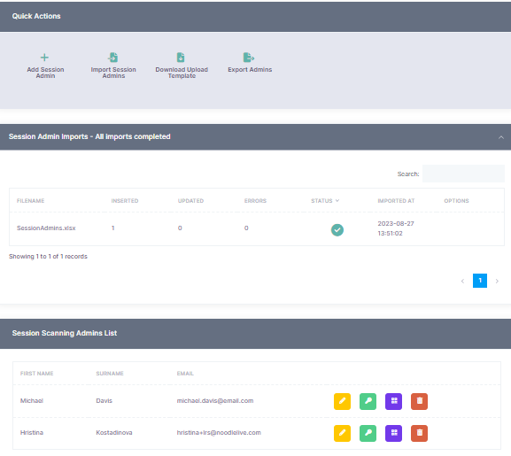 Session Scanning Admins Lists - displays a list of session admins with their details, as well as the options to manually edit and delete them or show a QR code (specific to each admin) used for logging into the Noodle Live session scanning app.