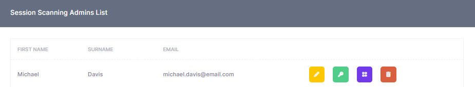 You can create new or edit existing Session Admins under the "Scanning Admins" section of the platform available under the Session Scanning module.