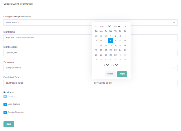 You can update all event details (such as the start/end dates and time, the time zone or the location) by simply changing the values and clicking the “Save” button at the bottom of the page.