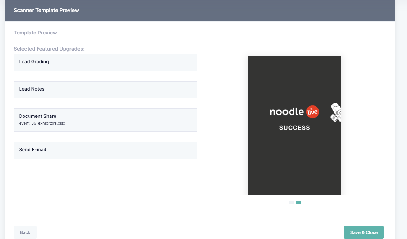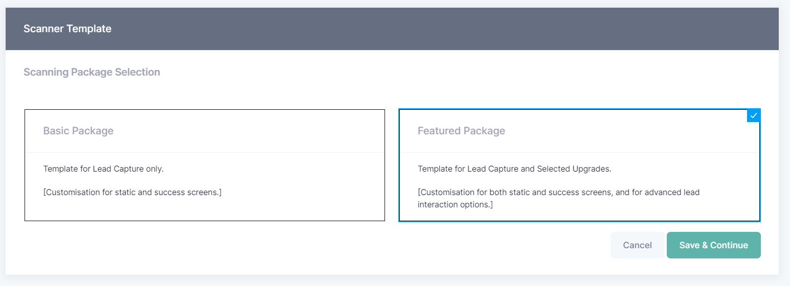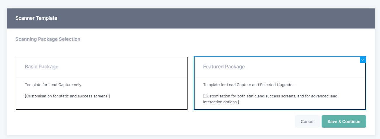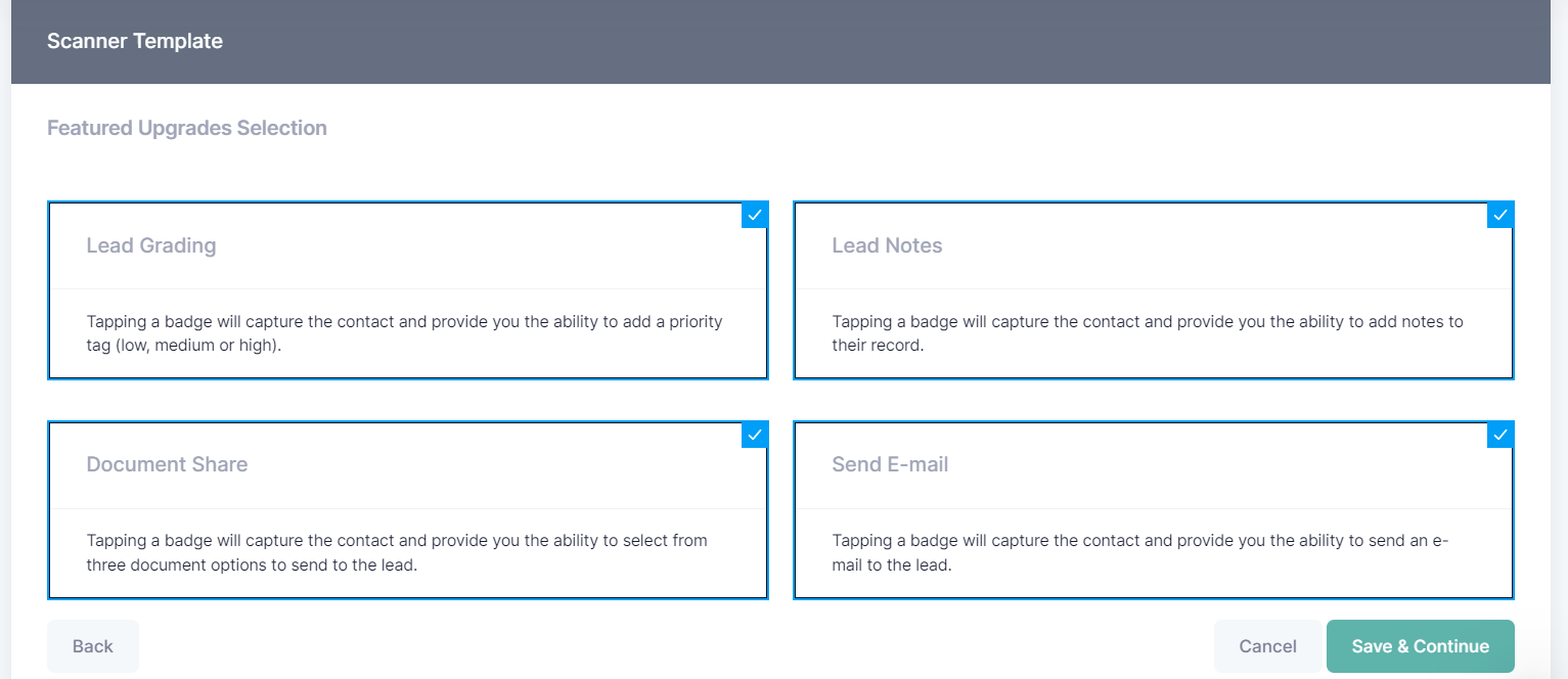 The Scanning Package will define the available lead capture actions such as basic lead retrieval, lead notes, lead grading and so on.