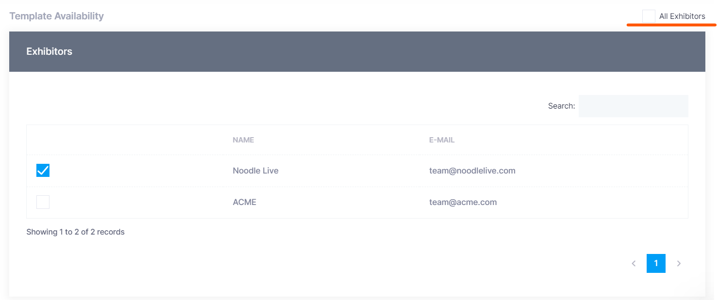 • Or you can check the “All Exhibitors” box at the top right to auto-assign the template to the whole list of exhibitors.