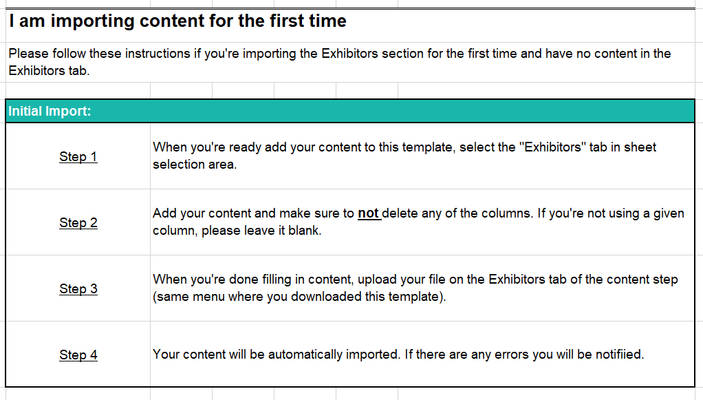 Once you have populated the exhibitor template file with all exhibitor companies and admins, please proceed as follows: