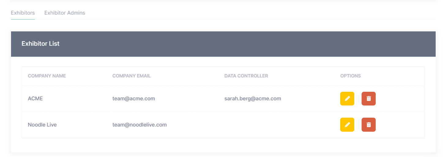 All newly created exhibitor admins will now be available under the “Exhibitor List” section, tab “Exhibitor Admins” at the bottom of the page.