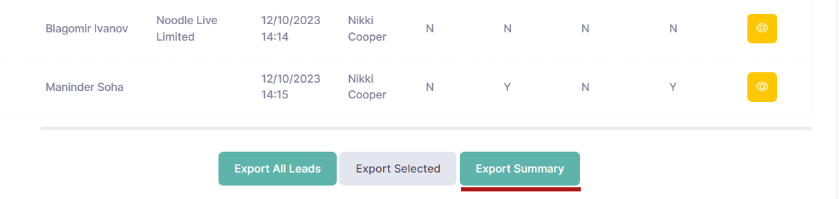Export Summary - to download the aggregated data (total number of leads, notes, ratings, etc.) for the selected exhibitor, please click the "Export Summary" button under the Lead Data section.
