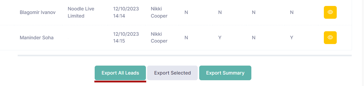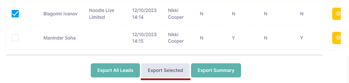 Export Selected - to download only selected leads data, please choose the relevant contact first by checking the box next to the contact name and click the "Export Selected" button under the Lead Data section.