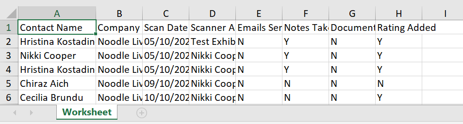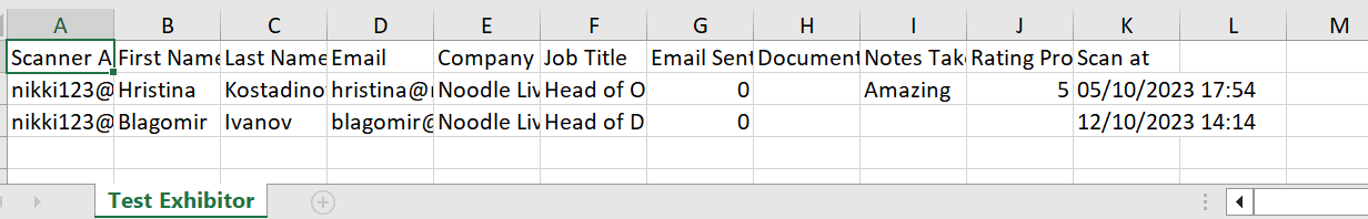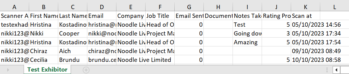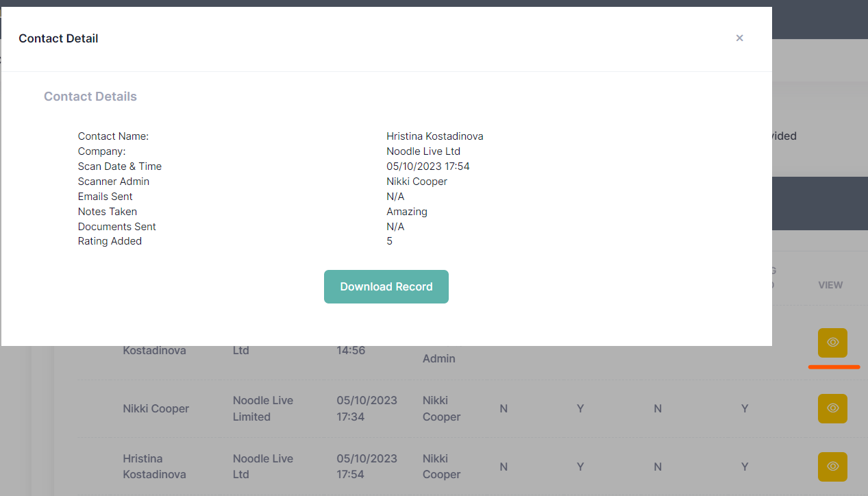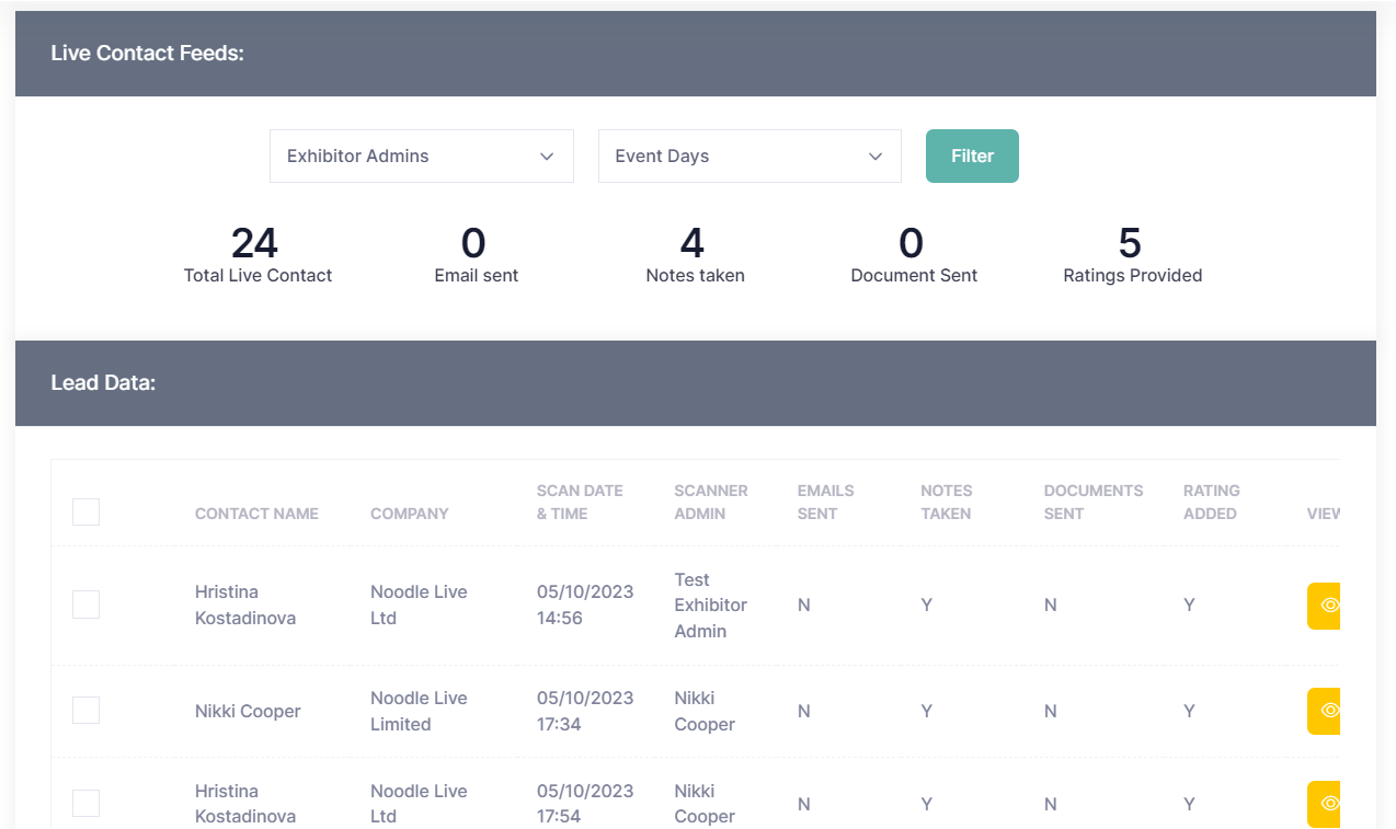 The second section on the page - Lead Data, provides a list of all captured leads for the selected exhibitor company with scan timestamp and all relevant actions taken by the exhibitor admin.