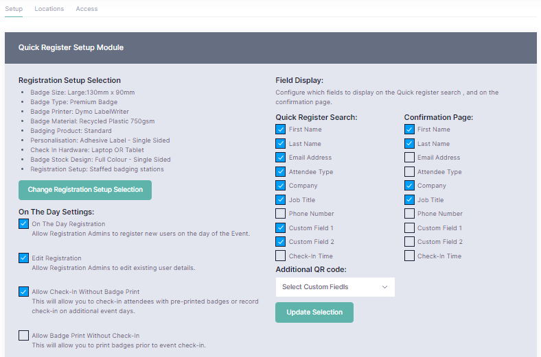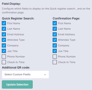 Please check the box for all fields you would like to be displayed on the Quick Register confirmation page after printing a badge.