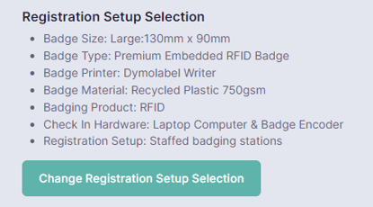 This section provides an overview of your registration setup on-site, depending on your previous selections in the Registration Wizard. It lists the badge stock and equipment items you would need for your badging stations.