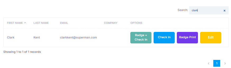 3. The newly created attendee will now be available in the list. Click on "Badge+Check In".